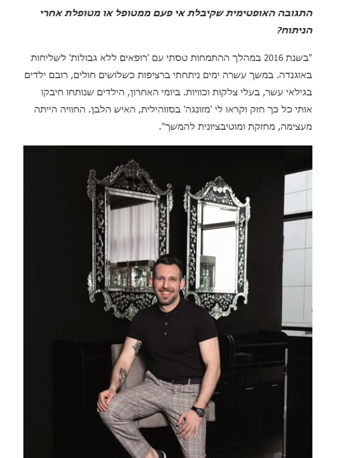 סיפור האהבה שלי עם תחום הכירורגיה התחיל עוד בימי ההתמחות שלי בבי"ח רמב"ם בחיפה, אז התאהבתי בתחום המיקרו-כירורגיה. טסתי להתנדבות באפריקה שם טיפלתי במטופלים בכפרים ועסקתי בעיקר בניתוחים של שחזורים וצלקות, בנוסף טסתי גם לטאיוואן ויפן לצורך התנסות לימודית והעשרה בתחום.