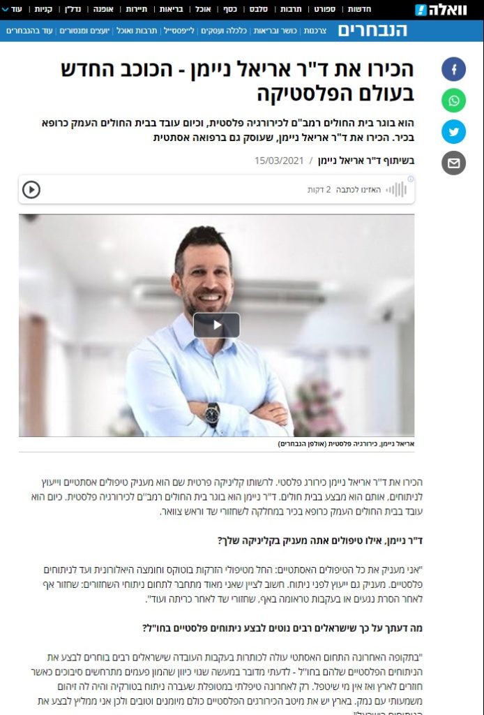 שמי ד"ר אריאל ניימן, מומחה לכירורגיה פלסטית ואסתטית וחבר באיגוד לכירורגיה פלסטית ואסתטית.
